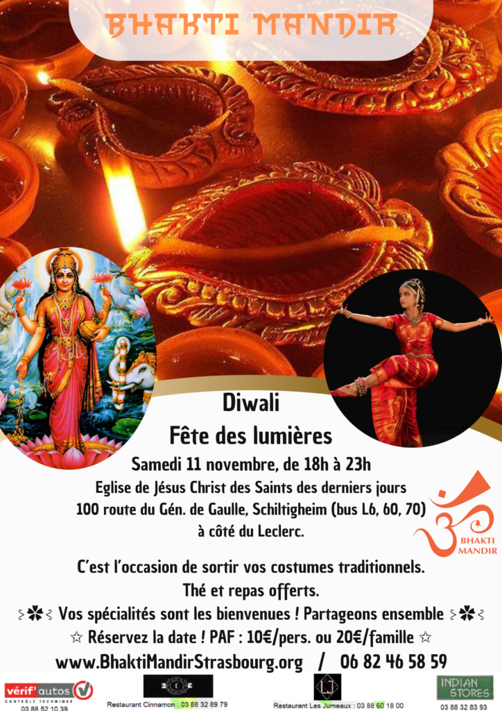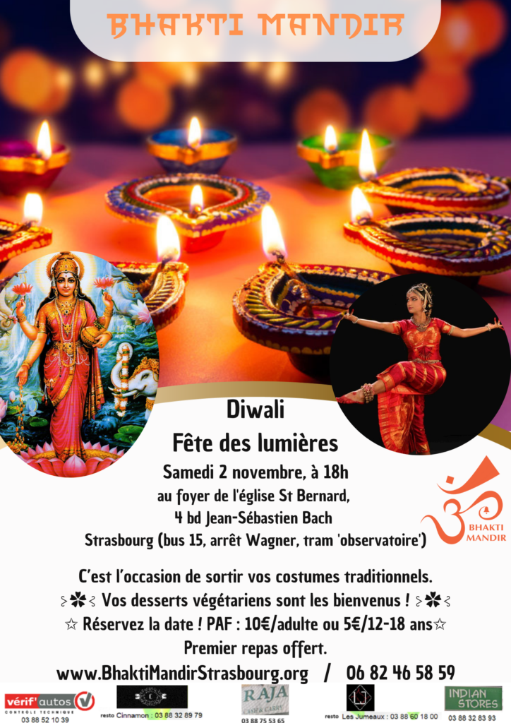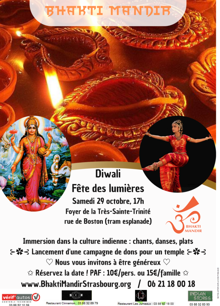 – Diwali : Samedi 25/10 à 18h, au foyer de l’église St Bernard, 4 Bd Jean-Sebastien Bach, Strasbourg (bus 15, arrêt Wagner / tram ‘observatoire’)